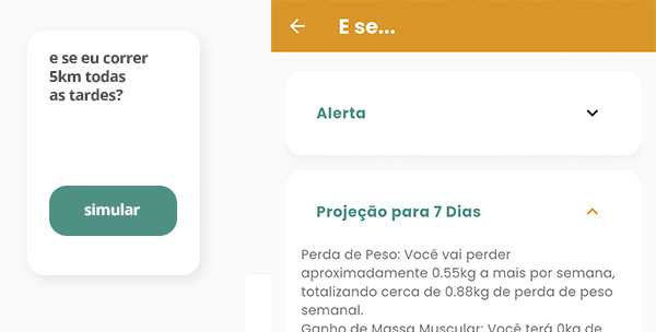 A IA mostra os efeitos esperados em peso, energia e resultados — para você decidir com consciência.