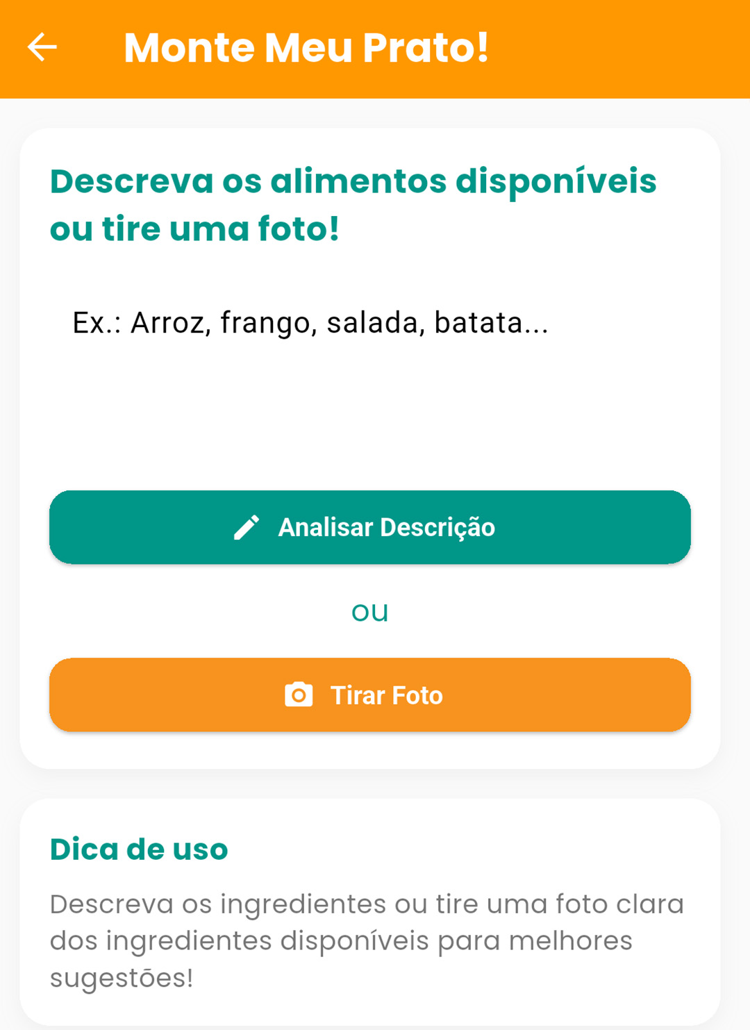 Sem ideias para o almoço? Basta dizer o que tem na geladeira — ou tirar uma foto — e o VivaFit monta um prato completo, dentro da sua dieta personalizada.